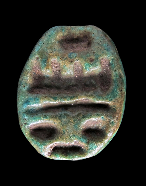 Scaraboide in steatite invetriata azzurra, con sul ventre ncisione della grafia difettiva del nome di Amon-Ra. Dorso a forma di testa umana dai lineamenti negroidi. La decorazione del ventre e del dorso sono capovolte l’una rispetto all’altra. Foro passante longitudinale.