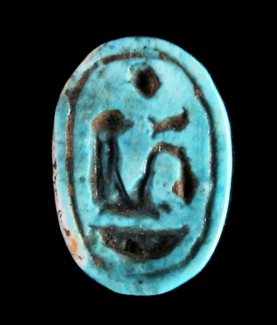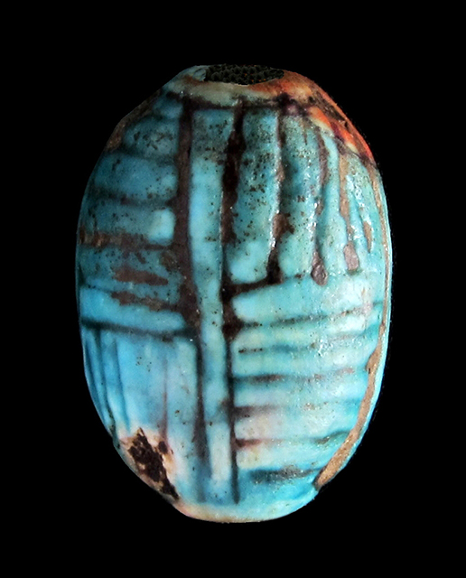 Scaraboide in steatite invetriata turchese con sul ventre una incisione che imita il nome Neb-maat-ra. Sul dorso un motivo centrale a croce dà origine ad una lavorazione geometrica. Foro passante longitudinale.