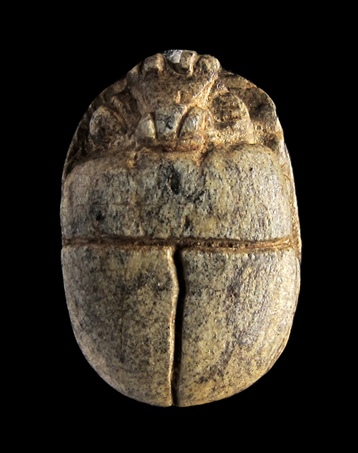 Scarabeo in steatite marrone; sul ventre, sotto un segno neb rovesciato si vede uno pseudo cartiglio imitante quelli col prenome di Thutmosi III in disposizione orizzontale, dal quale pende a sinistra un ureo. Davanti a questo vi è un falco molto stilizzato disposto perpendicolarmente rispetto al resto della decorazione. Dorso con clipeo; protorace ed elitre separati da incisione a T. Foro passante longitudinale.