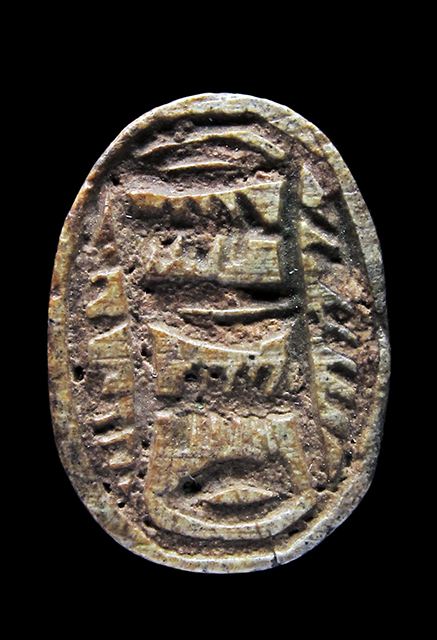 Scarabeo in steatite grigia con sul ventre una incisione, su una colonna affiancata da due segni neb, dello schema decorativo “a-n-r”. Dorso molto semplice, con incisione a V del clipeo e piccole tacche laterali all’altezza del protorace. Foro passante longitudinale.