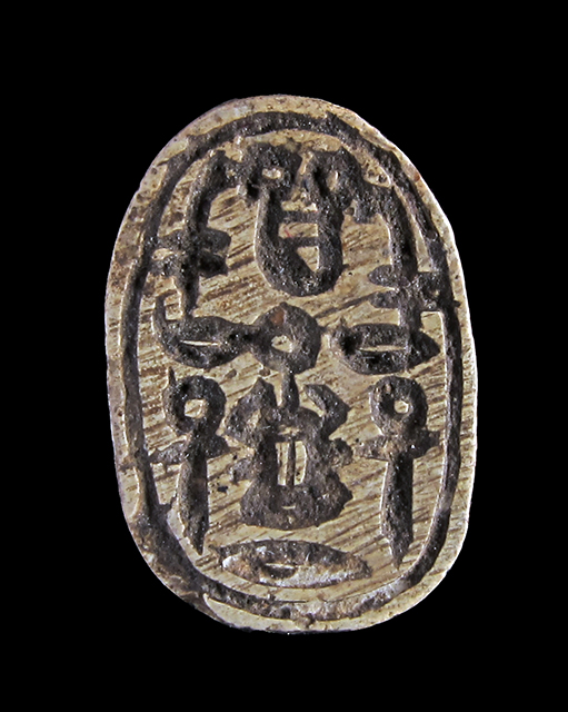 Scarabeo in steatite grigia; il ventre dello scarabeo è decorato con il prenome di Sesostri I (faraone della XII dinastia, 1994-1781 a.C.), Kheper-ka-ra, con ai lati segni geroglifici disposti simmetricamente. Dorso con semplice lavorazione del clipeo. Foro passante longitudinale.