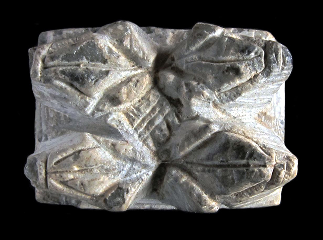 Sigillo in steatite. Su una faccia si vede il cartiglio col prenome di Thutmosi III in disposizione verticale, affiancato da due urei. Sull’altra sono raffigurate a rilievo quattro rane, simbolo di fecondità. Foro passante longitudinale.