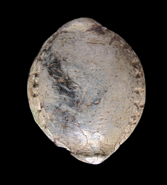 Scaraboide in steatite grigiastra con sul ventre incisione di motivo decorativo a spirale. Dorso che ricorda la forma di una conchiglia. Foro passante longitudinale.