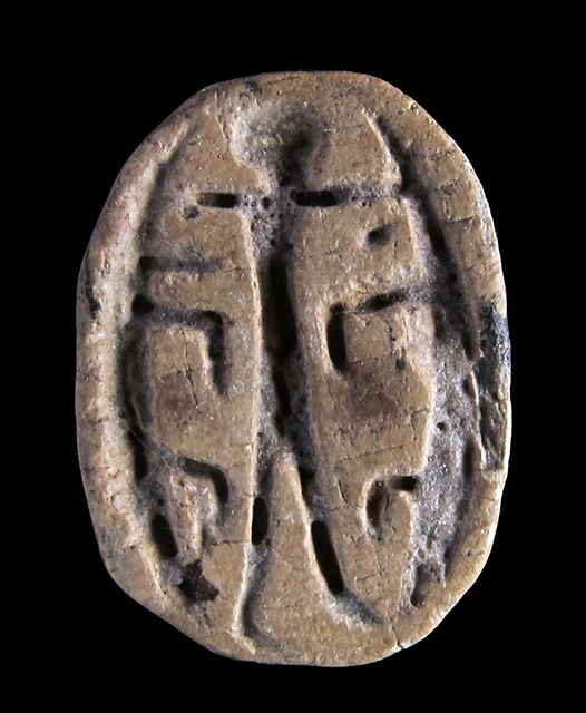 Scarabeo in steatite grigia con sul ventre rappresentazione di un uomo che tiene due coccodrilli per la coda. Dorso con lavorazione del clipeo e incisione a T che separa protorace ed elitre. Foro passante longitudinale.