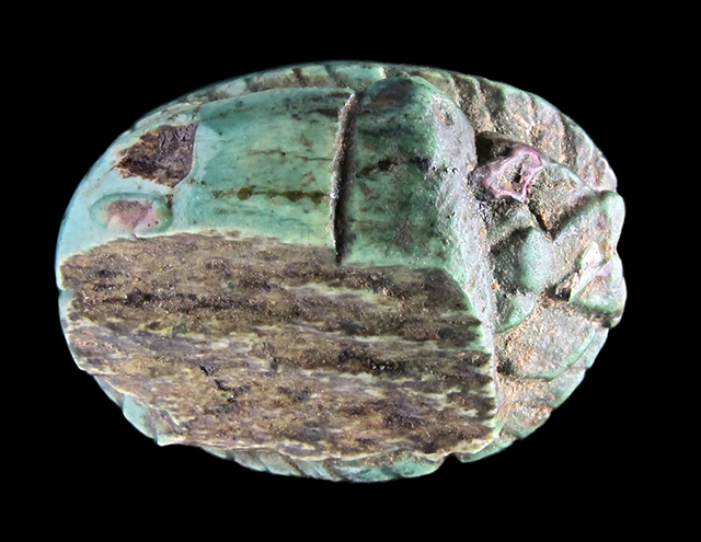 Scarabeo in steatite invetriata turchese con sul ventre incisione crittografica del nome di Amon-Ra. Sul dorso si intravedono le incisioni di clipeo, protorace ed elitre. Foro passante longitudinale.
