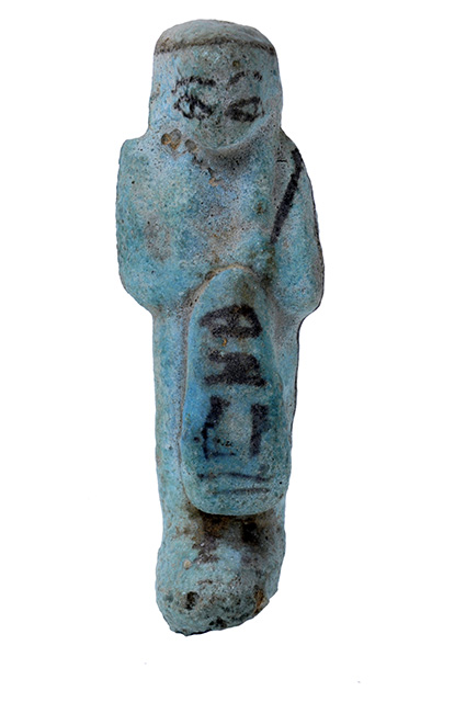 Statuina funeraria che indossa l’abito da vivente, con la parte anteriore della gonna che sporge formando un triangolo, e una parrucca tripartita con seshed. Le braccia sono incrociate, la destra sopra la sinistra, e la mano destra regge una frusta, nell’atteggiamento tipico degli ushabti “sorveglianti”. Tutti i dettagli sono stati dipinti in nero. L’iscrizione è composta da una colonna di geroglifici che copre la parte frontale della veste della statuina.