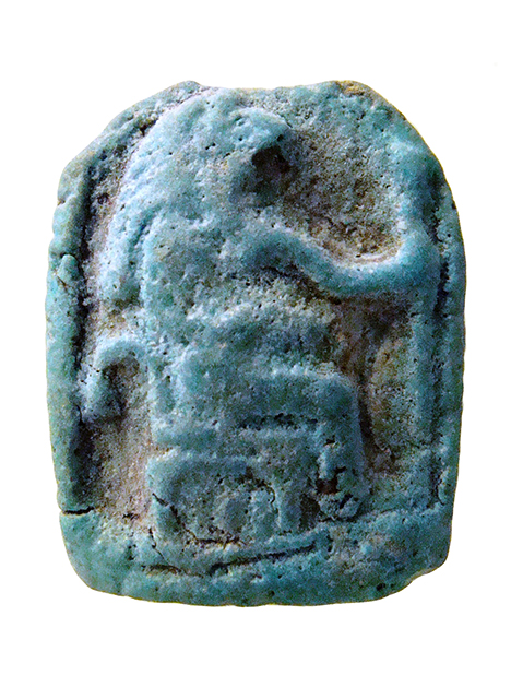 Amuleto in faience che ha la forma di una stele centinata. All'interno di un bordo rilevato, vi è una raffigurazione a rilievo della dea Sekhmet. L’iconografia è quella consueta, di donna con testa di leonessa. La dea è raffigurata di profilo, seduta su un trono a basso schienale; nella mano sinistra regge un lungo scettro wadj.