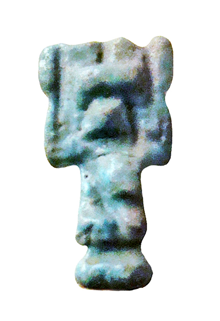 Amuleto in faience, alquanto stilizzato, raffigurante il dio dell'aria Shu. Il dio è raffigurato inginocchiato, con indosso un gonnellino e con le braccia alzate simmetricamente a reggere un disco solare sopra il capo. I piedi poggiano su una piccola base parallelepipeda, che dietro si sviluppa nel pilastro dorsale, forato per permettere la sospensione dell'amuleto.