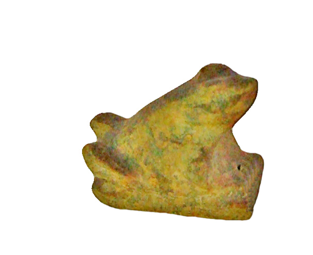 Amuleto in steatite lavorato a tutto tondo, raffigurante una rana che si appoggia su una piccola base; nonostante la minutezza dell'oggetto, la resa è abbastanza precisa e vivace.