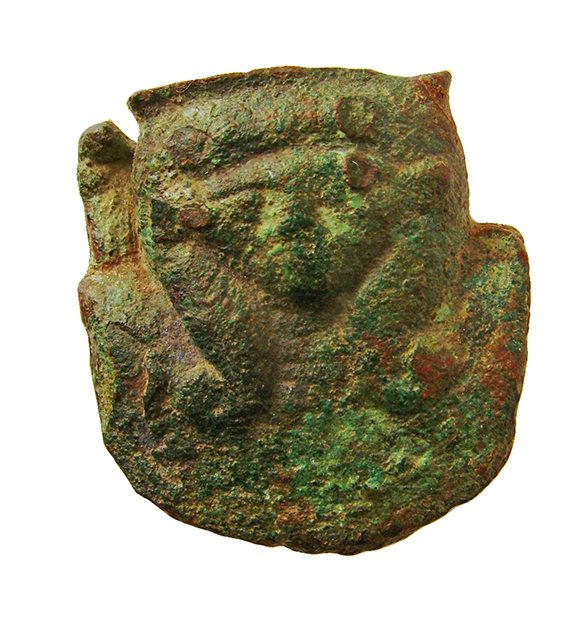 Frammento superiore di manico di sistro in bronzo, raffigurante su entrambi i lati il volto della dea Hathor, con l’ampia parrucca con fermagli e le piccole orecchie di vacca, oltre al largo collare al collo, e un ureo con disco solare che poggia sulla spalla destra. Il sistro era uno strumento musicale che, agitato, faceva vibrare delle barrette metalliche (munite o meno di sonagli) poste in un telaio, che ne costituiva appunto la parte superiore. Si tratta di uno strumento molto comune nell’antico Egitto, legato in particolare alle cerimonie religiose e attestato in vari materiali.