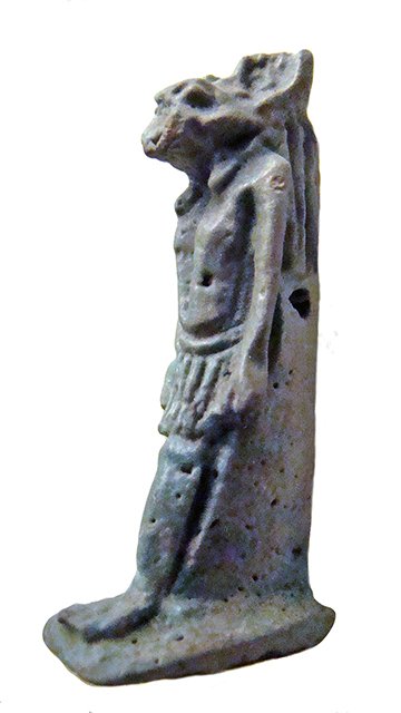 Amuleto in faience raffigurante il dio Anubi. Il dio dalla testa di sciacallo è raffigurato in piedi, nell’atto di camminare (con la gamba destra in avanti) e con le braccia stese lungo i fianchi; le mani sono chiuse a pugno. Le orecchie sono molto evidenti, così come il muso canino allungato. Indossa un corto gonnellino pieghettato. Data la minutezza della figura, i piedi poggiano su una piccola base parallelepipeda, mentre sul retro vi è il pilastro dorsale, che presenta un foro passante.