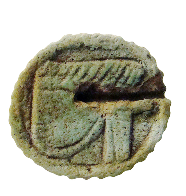 Piastrina circolare in faience, con bordo seghettato e foro passante, con funzione di amuleto. Raffigura su una faccia il volto della divinità apotropaica Bes, frontale con le orecchie sporgenti, le sopracciglia evidenziate, la barba e il grande naso piatto. Sul capo porta una corona di piume di struzzo. Sulla faccia opposta vi è l'immagine di un occhio udjat.