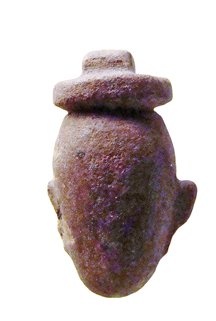 Amuleto in pietra lavorato a tutto tondo, con presa non forata nella parte superiore. Raffigura il geroglifico "ib", vale a dire il "cuore", con la massa ovoide centrale e le terminazioni dei tre vasi sanguigni (due sui lati e una in alto); vista l'importanza di quest'organo nel giudizio dei defunti nell'aldilà, un tale amuleto veniva posto tra le bende delle mummie per evitare che il vero cuore venisse rapito.