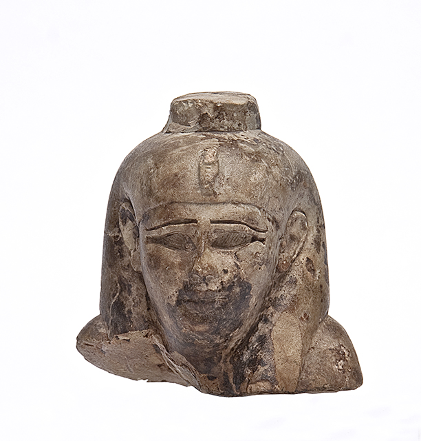 Della piccola statua rimane la testa troncata all’altezza delle spalle. Il delicato volto ha particolari incisi come la bocca e le sopraciglia mentre gli occhi dal campo ribassato e non lisciato mostrano che erano intarsiati in diverso materiale. La parrucca lascia libere le orecchie e scende tripartita. Sulla fronte è l’ureo e in cima alla testa l’imposta cilindrica su cui era fissato il diadema, probabilmente metallico.