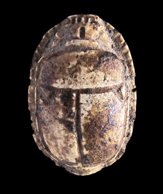 Scarabeo in steatite grigia con sul ventre una rappresentazione del faraone inginocchiato in atto di adorazione davanti al dio Thot in forma di babbuino. Sopra di essi dei segni geroglifici non leggibili, probabilmente il nome del sovrano. Dorso con clipeo sulla testa e incisione a T che separa il protorace dalle elitre, sulle quali sono incise tacche a V; in basso è visibile lo scutello. Foro passante longitudinale.