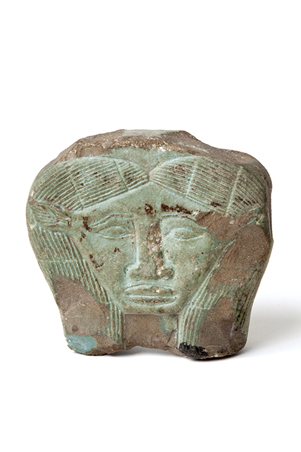 Frammento superiore di manico di sistro in faience azzurra, raffigurante su entrambi i lati il volto della dea Hathor, con l’ampia parrucca e le piccole orecchie di vacca. Il sistro era uno strumento musicale che, agitato, faceva vibrare delle barrette metalliche (munite o meno di sonagli) poste in un telaio, che ne costituiva appunto la parte superiore. Si tratta di uno strumento molto comune nell’antico Egitto, legato in particolare alle cerimonie religiose e attestato in vari materiali.