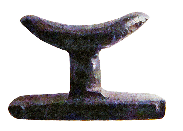 Amuleto in pietra, lavorato a tutto tondo e privo del foro passante, che raffigura un poggiatesta, con la base parallelepipeda, il sostegno centrale cilindrico e la parte sommitale arcuata per permettere l'appoggio del collo. Gli egizi usavano i poggiatesta per dormire, invece dei cuscini, a causa del caldo. Gli amuleti a forma di poggiatesta erano normalmente di colore scuro, e venivano posti sotto il collo delle mummie per garantire un tranquillo riposo nell'aldilà, senza che venisse disturbato da mostri o demoni.