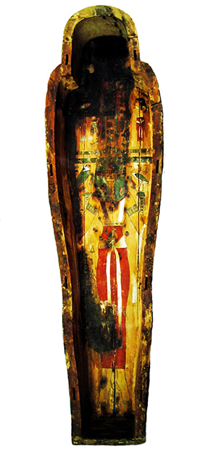 Coperchio del sarcofago Il coperchio antropoide presenta un volto dai tratti ben modellati, circondato da una parrucca a fasce longitudinali, che ricade con due bande sul petto. Sulla sommità del capo è raffigurato uno scarabeo nero con le ali aperte e allargate, fiancheggiato dal geroglifico della benda ripiegata, sormontata a destra dal segno dell’Oriente e a sinistra dalla piuma simbolo dell’Occidente. Il petto è ricoperto dal collare-usekh e da cinque registri con scene e testi, che mostrano (dall'alto): - La dea Nut ad ali spiegate, chiamata nelle brevi iscrizioni geroglifiche accanto alla testa "signora dell’Occidente" e "signora della Duat"; - Il dio Osiride, seduto su trono a basso schienale, con alle spalle la dea Iside, a cui si rivolge il dio Horo, che introduce il defunto, stante alle sue spalle. Tra i due dei, un fiore di loto sorregge i quattro geni funerari (i figli di Horo). Chiude la scena, all’estremità sinistra, su alto supporto, la dea Uto alata a testa leonina e coda di serpente, con disco solare sul capo e tra le ali il simbolo udjat. I geroglifici riportano i nomi dei personaggi raffigurati; - Al centro, in un naos (o tempietto, in forma dell’antico santuario del Basso Egitto) su un alto supporto, è posta la barca celeste Henu con un grande flabello a prua e la poppa a testa d’orice. Sulla barca naviga il Sole, in forma di falco, con il quale il defunto si identifica. A sinistra, la dea Neith inginocchiata protende le braccia flesse verso la barca, mentre dietro ha lo scettro-sekhem; in posizione simmetrica dall'altro lato, la dea scorpione Selkis, con alle spalle il geroglifico dell’Occidente. I due brevi testi accanto alle dee indicano l'azione da esse compiuta: "proteggere Pa-sen-en-hor"; - Due colonne di testo al centro (che coprono anche il rialzo dei piedi) dividono il quarto registro: a sinistra vi è una scena con il dio Horo che unge il defunto mummiforme (accompagnato da due brevi iscrizioni "Horus figlio di Iside e di Osiride" sotto la scena e "Proteggere Pa-sen-en-hor alle spalle del dio); a destra la scena è simmetrica, ma con il dio Anubi (identificato grazie all'iscrizione sotto la scena, che recita "Anubi, signore della terra sacra, preposto alla tenda dell'imbalsamazione"); - Sul rialzo dei piedi, ai lati delle colonne del testo, due emblemi dell’Occidente. Cassa del sarcofago Sui lati esterni della cassa vi sono due uniche righe di iscrizione in bei caratteri geroglifici, mentre all'interno il fondo della cassa è occupato per circa due terzi dalla figura della dea Nut, ritta, vista frontalmente. La dea ha braccia aperte, flesse verso l’alto, protese sui lati della cassa, e in ciascuna mano tiene il segno della vita. Porta sul capo ampia parrucca dipinta in verde, le cui bande anteriori le incorniciano il volto, disegnato frontalmente. Vicino al corpo della dea, a sinistra, si scorgono tracce di segni geroglifici, purtroppo illeggibili. All’altezza del capo, la dea è fiancheggiata, a destra dal falcone Harakhti (= Horo dell’Orizzonte) e a sinistra da un airone, sui quali sono alcuni geroglifici e il segno della vita; ambedue gli uccelli stanno sul geroglifico dell’Occidente, e sono dipinti in verde, col piumaggio nero e bianco. Sopra la dea Nut, e separato da questa da due fasce verde scuro (quella inferiore con una serie di stelle affiancate, ideogramma del cielo stellato, quella superiore a segmentini verde chiaro) si erge il pilastro djed sormontato dal disco solare, e fiancheggiato da due dee, molto probabilmente Iside e Nefti. La zona davanti all’altra dea e quella soprastante il disco solare in corrispondenza all’appoggio della testa del defunto, invece, sono fortemente impregnate di bitume.