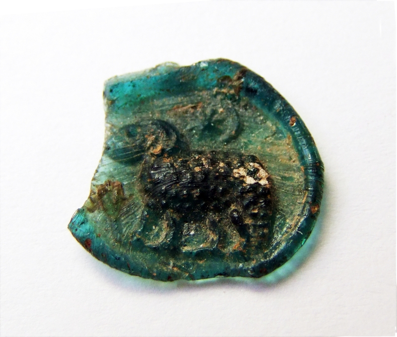 Pendente di forma circolare: decorazione data da agnello stante a sin.; pelame reso da fitta rete di punti rilevati. Linea di base, da cui , a sin. dell'animale, sorge fiore su stelo. In campo, al centro, sopra all'animale, stella a otto punte e crescente lunare con punte volte a sin.