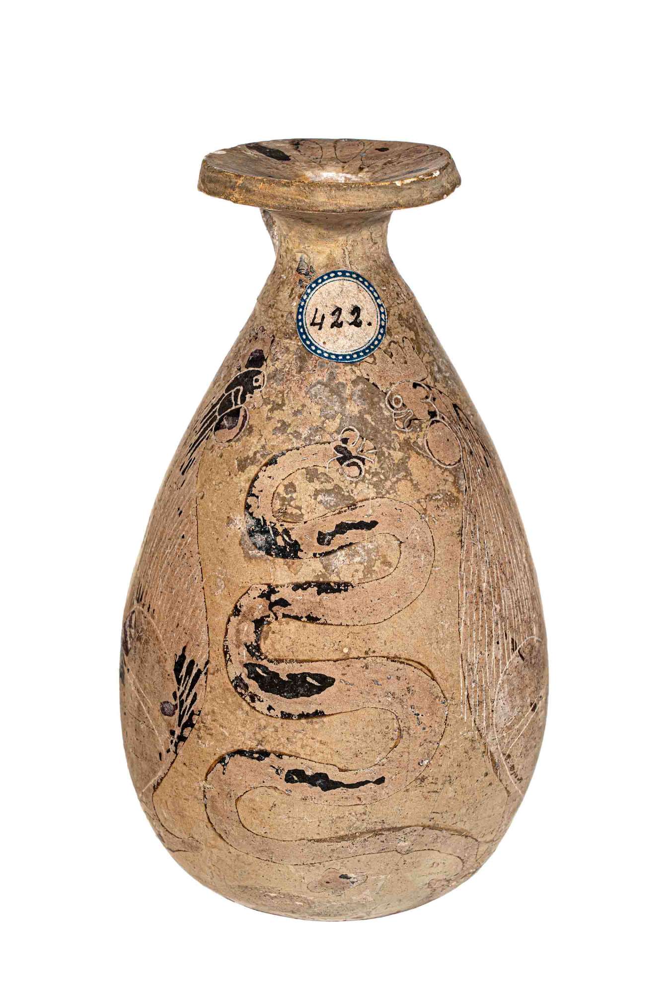 Alabastron corinzio con piccola ansa forata. Sull'ingubbiatura bianca tracce di figure brune in parte graffite serpe ritta fra due galli e nel campo rosette e raggiera di petali.