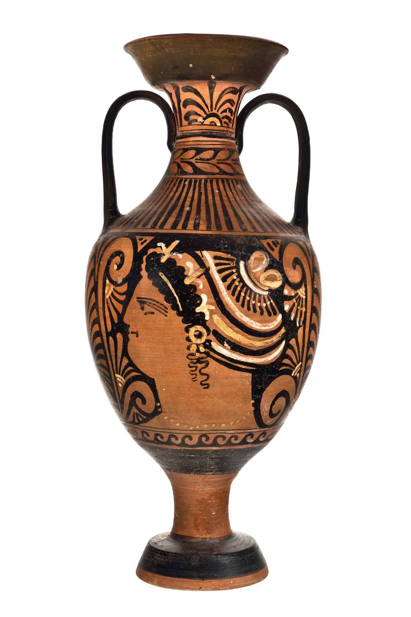 L'anfora che i venditori indicano come rinvenuta a Caelium, era già attribuita al Gruppo delle anfore; Trendall la attribuisce al Pittore di Copenhagen Head, seguace dei Pittori della patera e di Baltimora.