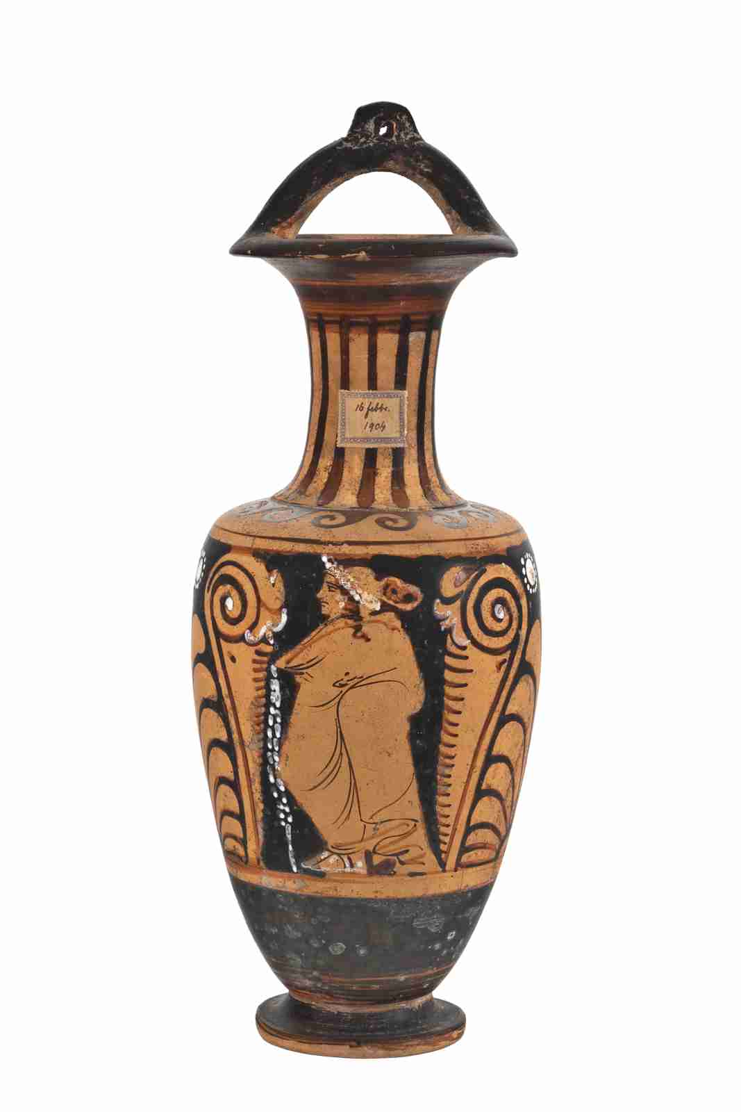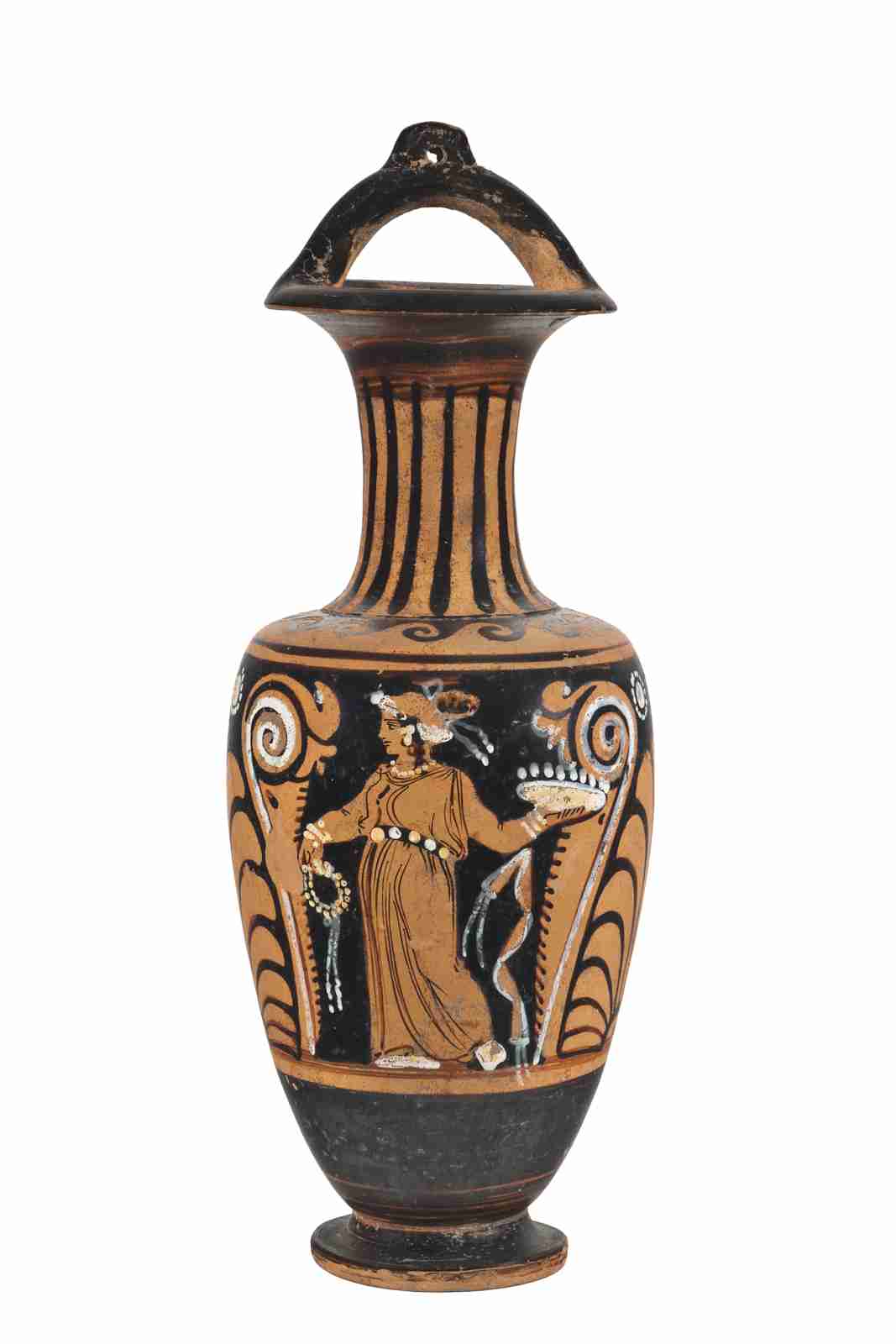 Il corpo del vaso è ovoide e allungato verso il basso, poggia su un piede a disco semplice grazie a un cortissimo stelo. Il collo, distinto da un listello, è lungo e cilindrico, con profilo concavo e orlo estroflesso. L'ansa sopraelevata presenta un foro per la sospensione. La vernice nera, opaca, risparmia l'interno dell'ansa a staffa e il bordo esterno del piede e copre completamente l'orlo, la parte superiore del collo e la parte bassa del corpo del vaso; sotto il labbro e sulla parte bassa del corpo del vaso risulta diluita. Molti dettagli sono resi con sovradipinture bianche. Una linea nera, il cui colore è diluito, segna il piano di appoggio della composizione principale. Il colore dell'argilla è Munsell 5YR 7/6 (reddish yellow). Sul lato A è rappresentata una fanciulla stante, incedente verso sinistra, con il volto di profilo e il busto di tre quarti; porta il peso sulla gamba destra, mentre la sinistra è leggermente flessa. I capelli ricciuti sono raccolti in uno chignon con un sakkos e un nastro bianco annodato a fiocco, con un ciuffo che sfugge e scende fino al collo. La figura è riccamente ingioiellata con una ghirlanda sul capo, orecchini con pendenti, collana di perle e bracciali, tutti resi in bianco. Indossa un lungo chitone pieghettato, che lascia intravedere la gamba sinistra, retto da un cinturone ornato, reso in nero con sovradipinture bianche; bianchi sono anche i piedi, probabilmente a rappresentare delle calzature. Con la mano destra regge un serto con un nastro pendente, con la sinistra, protesa all'indietro, una patera con offerte: tutti gli attributi sono resi in bianco. Dal polso sinistro sembra inoltre pendere una tenia, decorata con un orlo bianco. Sul lato B, una figura femminile ammantata, stante e perfettamente di profilo a sinistra; il volto è molto simile a quello della figura del lato A, con la stessa capigliatura e ornamenti. L'himation, caratterizzato solo da poche pie-ghe, copre completamente le forme del corpo, lasciando scoperti solo i piedi e facendo intuire la posizione del braccio sinistro, flesso all'altezza della vita. Le calzature sono ben caratterizzate, con dettagli in nero e in bianco. La composizione è completata da un elemento vegetale a spiga a sinistra della figura ammantata. Come motivi accessori, il collo è ornato da una baccellatura, mentre sulla spalla troviamo un motivo a onde mari-ne capovolte sinistrorse, limitato da due linee nere. Ai lati della composizione figurata, limitata in alto e in basso da due filetti risparmiati, si trova un motivo vegetale con una palmetta centrale con due girali fioriti e fogliati ai lati, con sovradipinture bianche. In alto, sopra la palmetta, ai lati della foglia centrale lunga e appuntita, due mo-tivi floreali stilizzati in bianco. Da notare che il braccio sinistro della figura femminile del lato A si sovrappone al gi-rale della decorazione accessoria e la forma a pettine delle foglie laterali. Sul collo, sul lato B, si è conservata una vecchia etichetta recante la data di acquisizione da parte del museo (“12 febbraio 1904”); l'attuale numero di inventario generale è invece scritto sotto al piede.