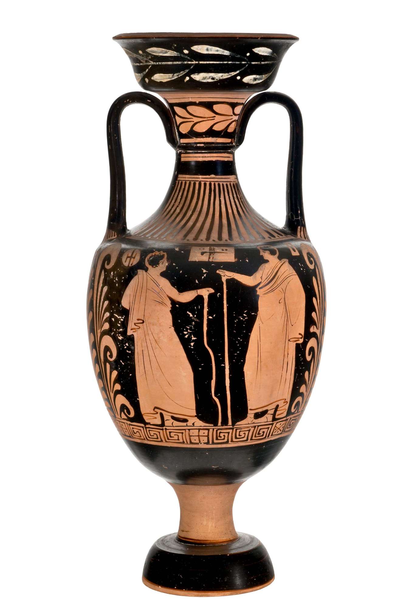 Anfora panatenaica apula a figure rosse. Lato A: scena di offerta: una colonna con grande bacile sulla sommità, ai lati un giovane nudo con alabastron e una donna con specchio e cista. Lato B: due giovani ammantati, coppia di halteres.