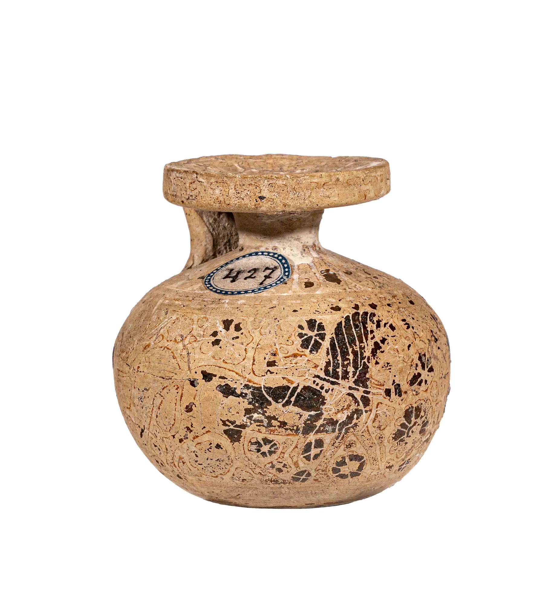 Aryballos corinzio con tracce di figure non chiaramente identificabili: due quadrupedi affrontati; nel campo rosette e sul fondo girandola iscritta in un cerchio.