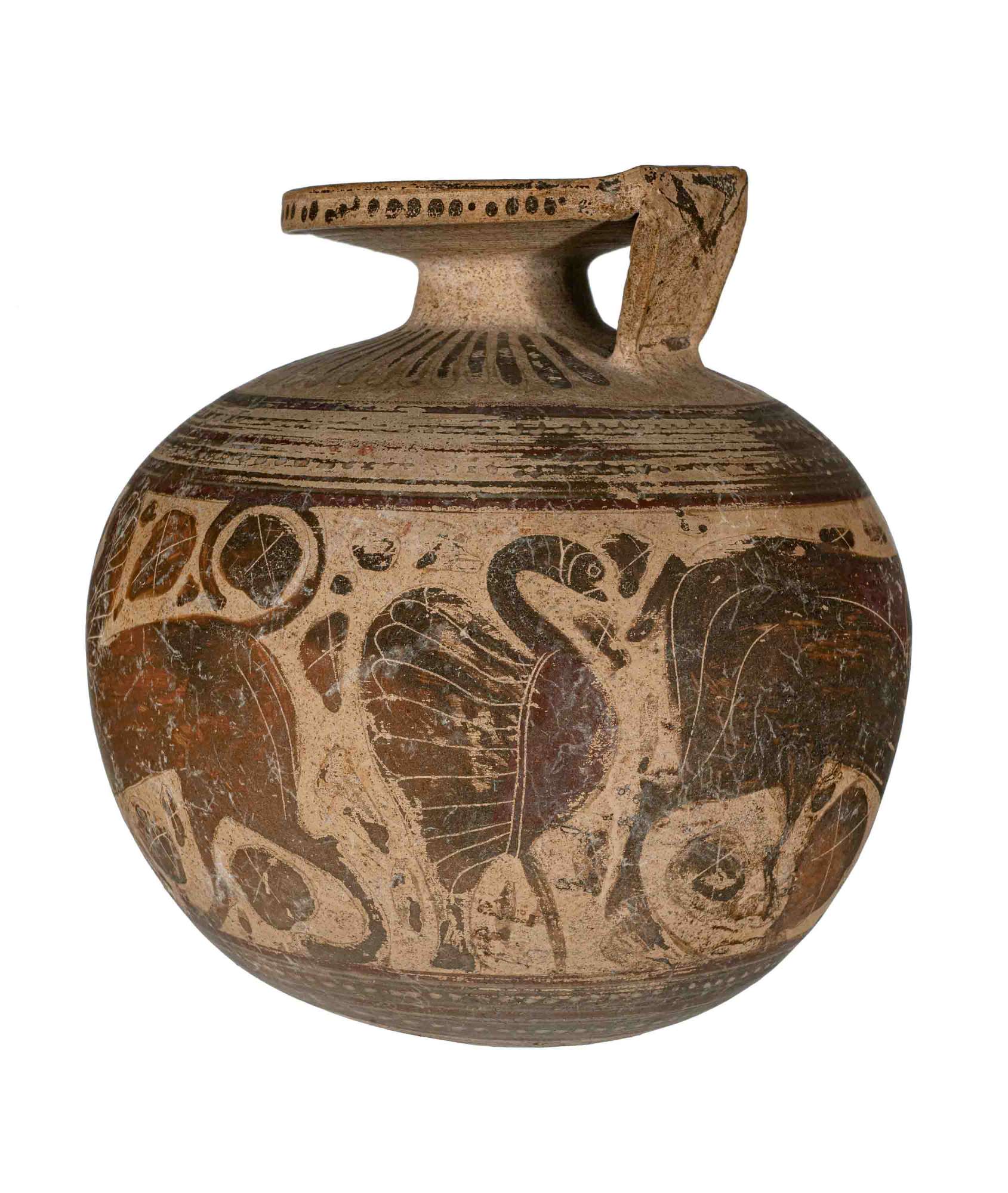 Aryballos etrusco-corinzio con sfingi, cigno e stambecco