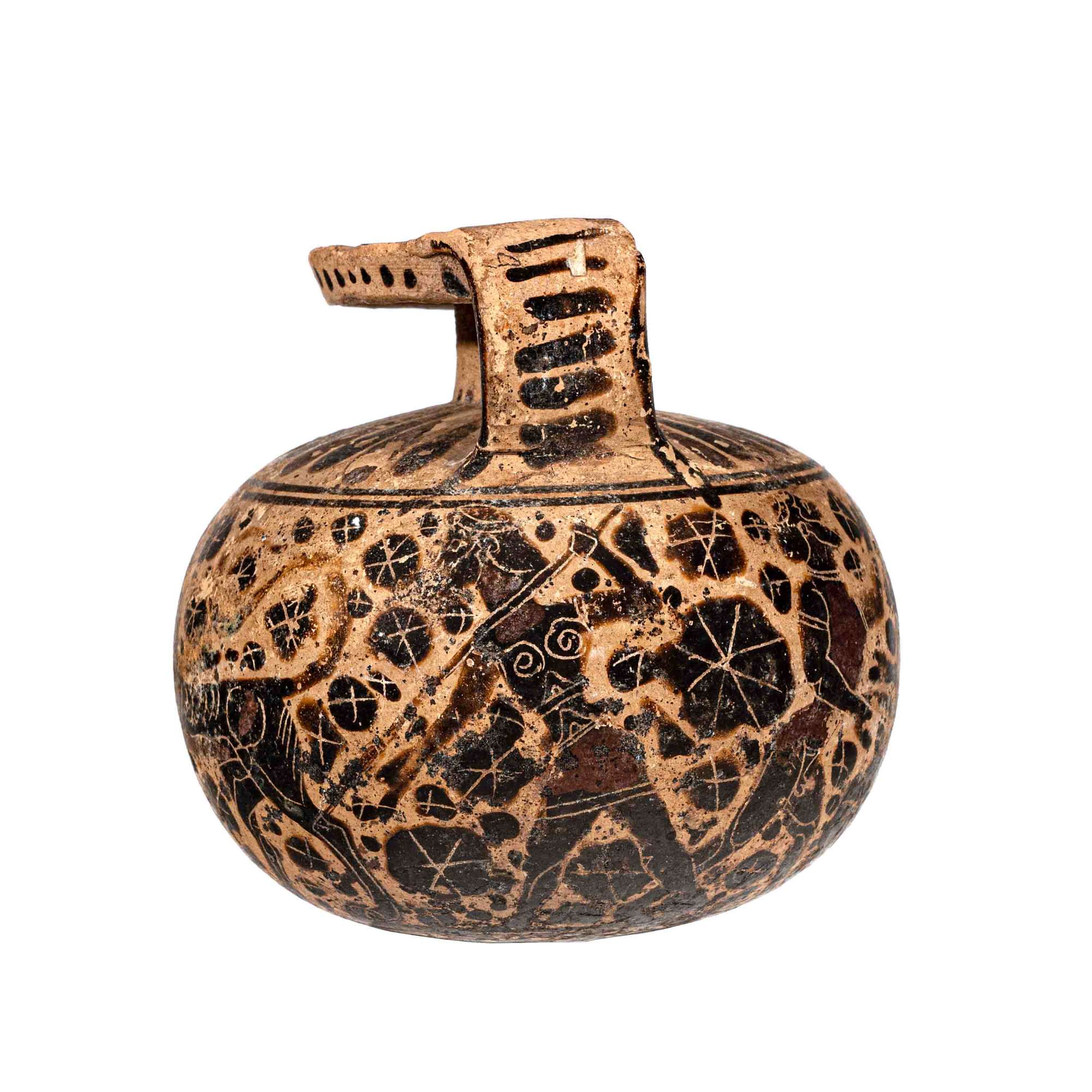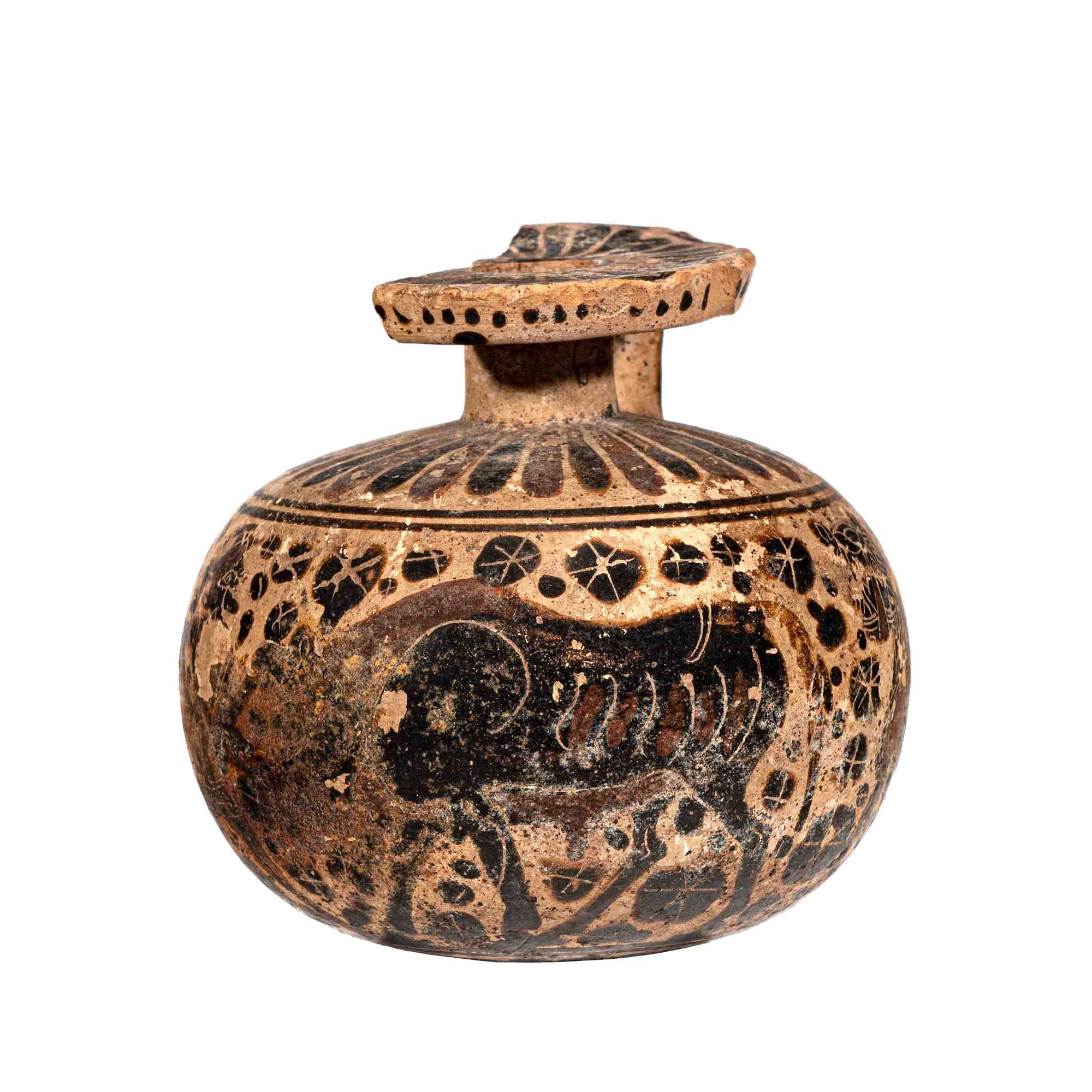 Aryballos corinzio con pantera, guerrieri e toro tra rosette.