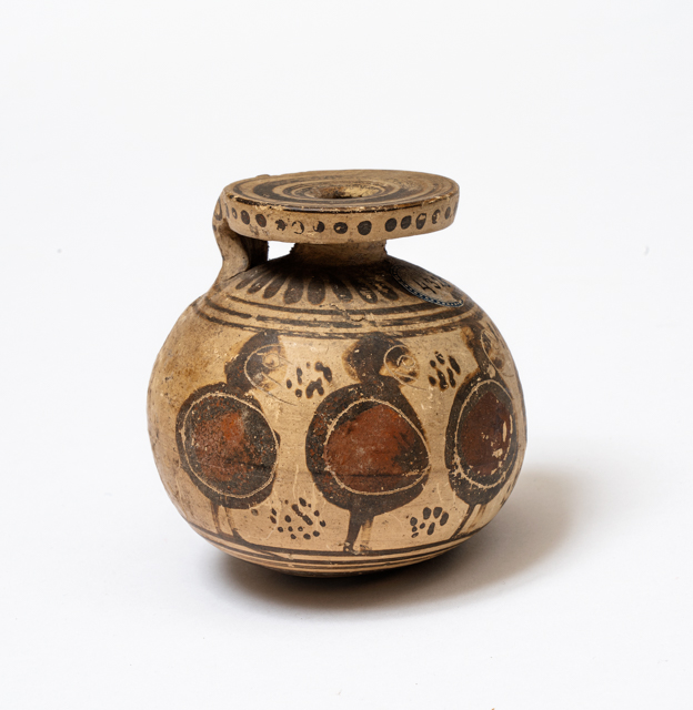 Aryballos corinzio a corpo espanso con tracce di ornamenti e figure rosso-brune. Tre figure barbute (comasti) in atto di danzare in mezzo a fiori e foglie. Il fondo è ornato da una stella.