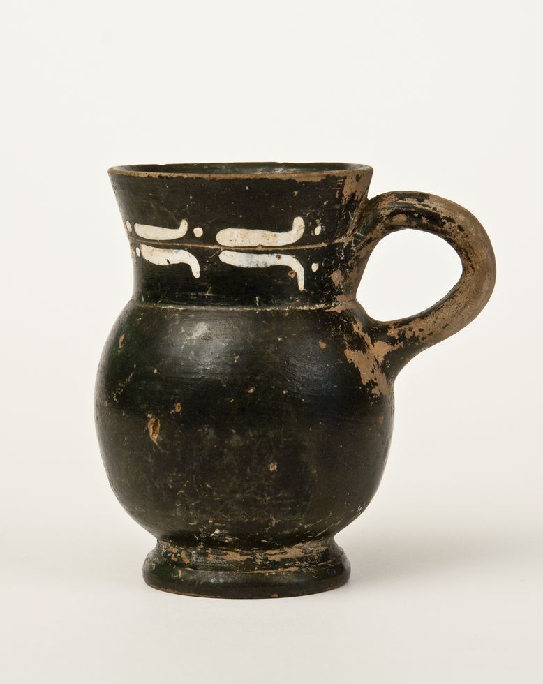 Boccaletto non scannellato a vernice nera con sovraddipinture in bianco ed incisioni. Orlo leggermente estroflesso, collo troncoconico, corpo globulare, ansa a nastro ad anello verticale, piede troncoconico. Sul collo: ramo di ulivo selvatico o tralcio di alloro con stelo inciso, coppia di foglie, all’estremità ricurve e bacche dipinte in bianco.