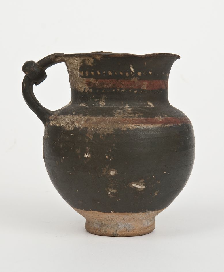Boccaletto a vernice nera, tendente all'olivastro, sovraddipinture in bianco, giallo e rosso amaranto. Orlo estroflesso, collo a profilo concavo, corpo globulare e particolarmente espanso all’estremità superiore, ansa a naso con nodo erculeo, piede ad anello, fondo leggermente apicato. Sul collo: ramo secco con largo stelo in rosso amaranto e foglie puntiformi in giallo. Sulla spalla: fascia in rosso.