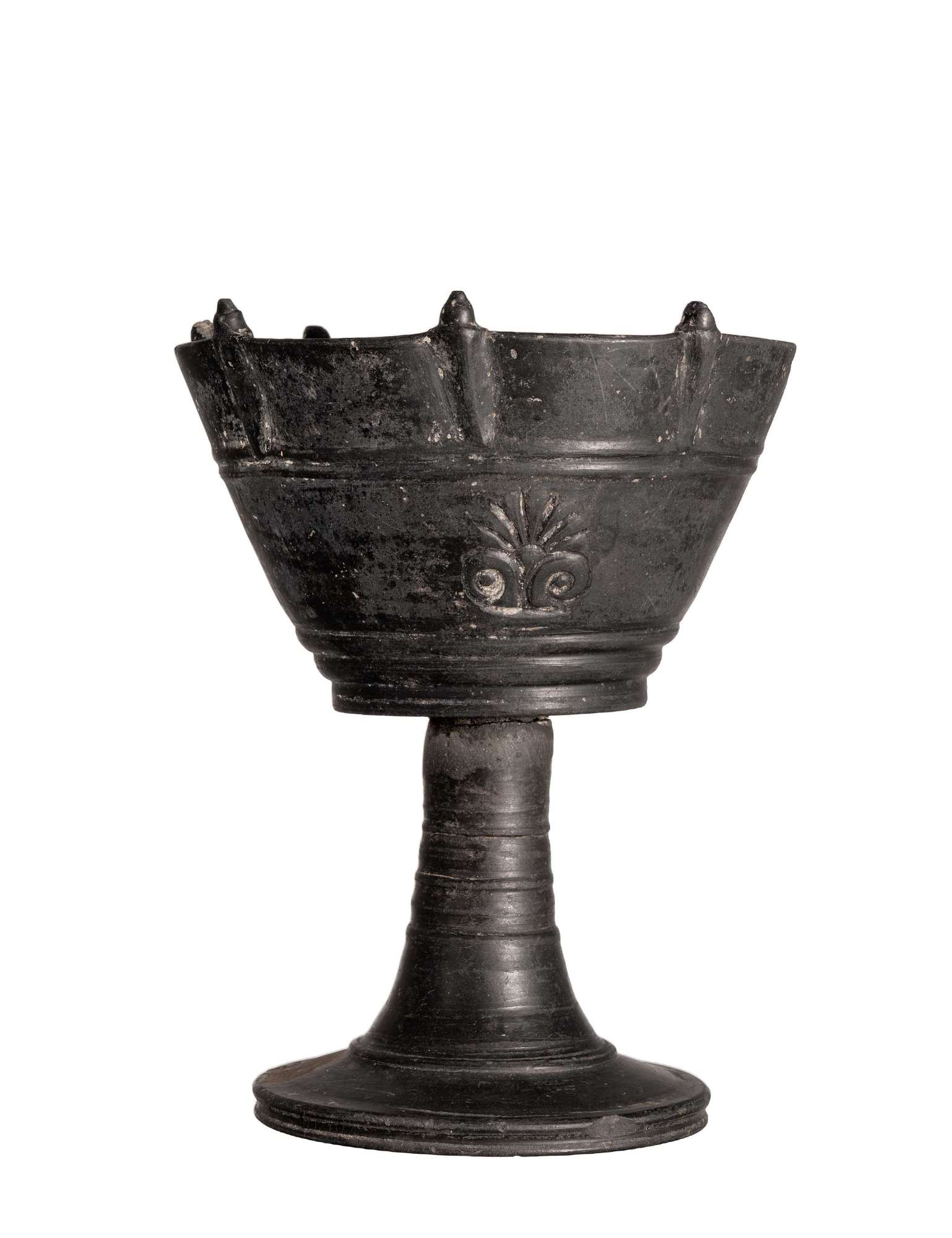 Calice ad alto stelo, coppa a tronco di cono capovolto ornata (come il piede ed il collo) da cerchi rilevati e antefisse a palmette. L'orlo è scandito in parti da piccole sporgenze a forma di chiodi.