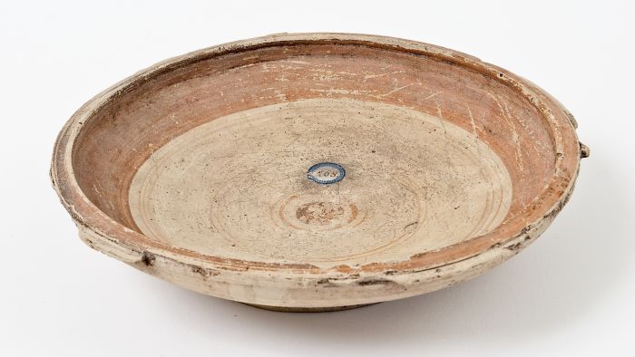 Coppa con vasca fonda, a profilo convesso. Piede ad anello, labbro orizzontale a listello interrotto, con sette prese orizzontali ad aletta. Decorazione interna in rosso diluito, su fondo chiaro; larga fascia lungo l’orlo e serie di linee parallele concentriche, con cerchio pieno al centro.