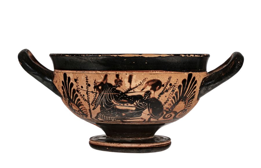 Cup-skyphos attica a figure nere priva di colori aggiunti ma con graffito. Lato A e B: La dea Atena stante, con himation e chitone, indossa elmo attico e regge la lancia e lo scudo con cui incalza il gigante che giace a terra in ginocchio e si poggia su uno scudo concavo; è nudo e indossa un elmo attico. Ai lati si vedono due cespugli con frutti.