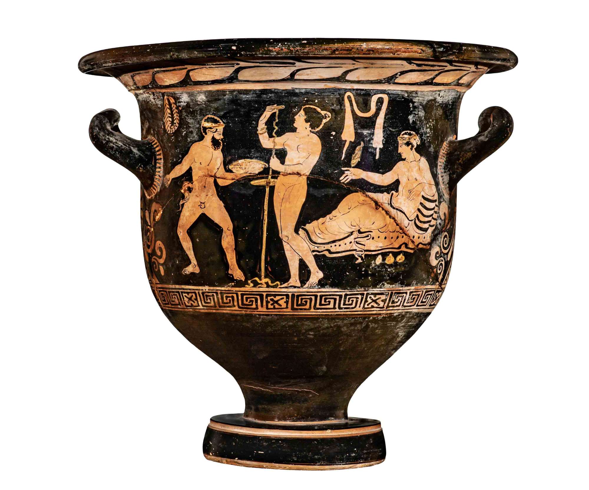 Cratere a campana a figure rosse. Lato A: Dioniso satiro e menade nuda (secondo scheda, gioco del kottabos, ma mancano elementi del lancio). Lato B: tre giovani vestiti ammantati.