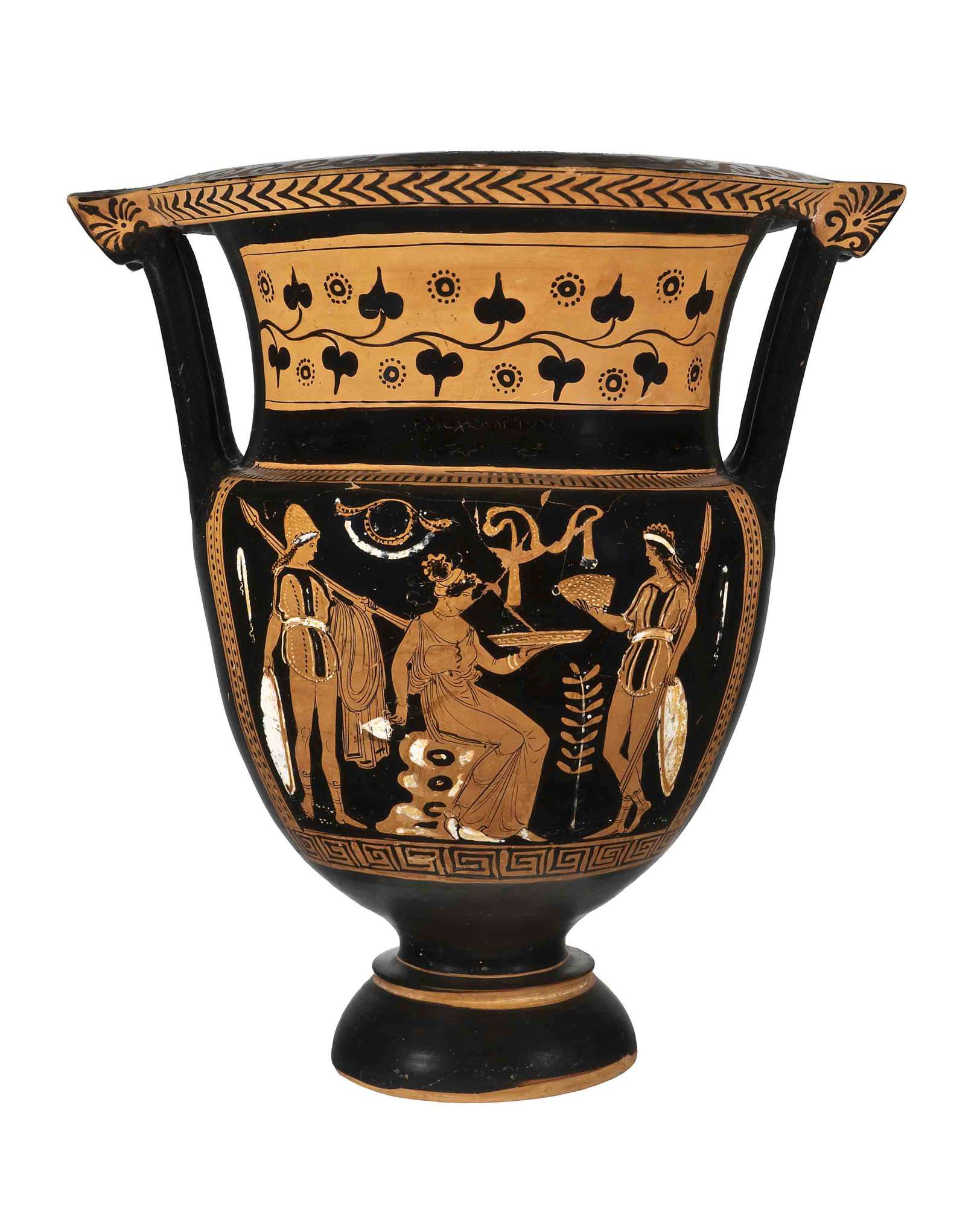 Cratere a colonnette apulo a figure rosse: decorazione a serto d'edera sul collo. Lato A>: scena d'offerta: donna seduta con patera e oinochoe; guerriero stante con scudo e lancia>; secondo guerriero con scudo, lancia e pilos. Lato B: tre giovani ammantati e coppia di halteres e dittico con stilo.