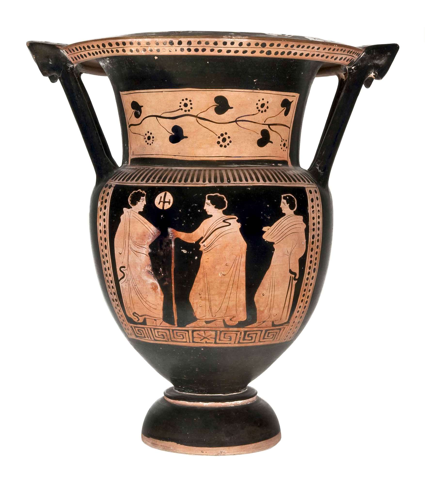 Cratere a colonnette apulo a figure rosse. Lato A: Dioniso seduto con tirso, menade stante con timpano, satiro con situla. Lato B: tre giovani ammantati, coppia di halteres.