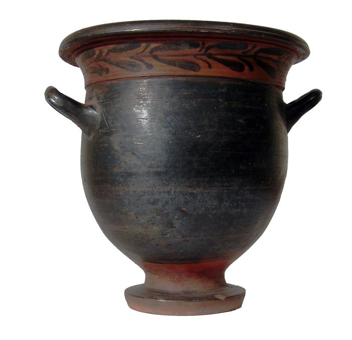 cratere a campana nero a corpo allungato; decorazione con ramo d'ulivo sotto l'orlo nero su fascia rossa