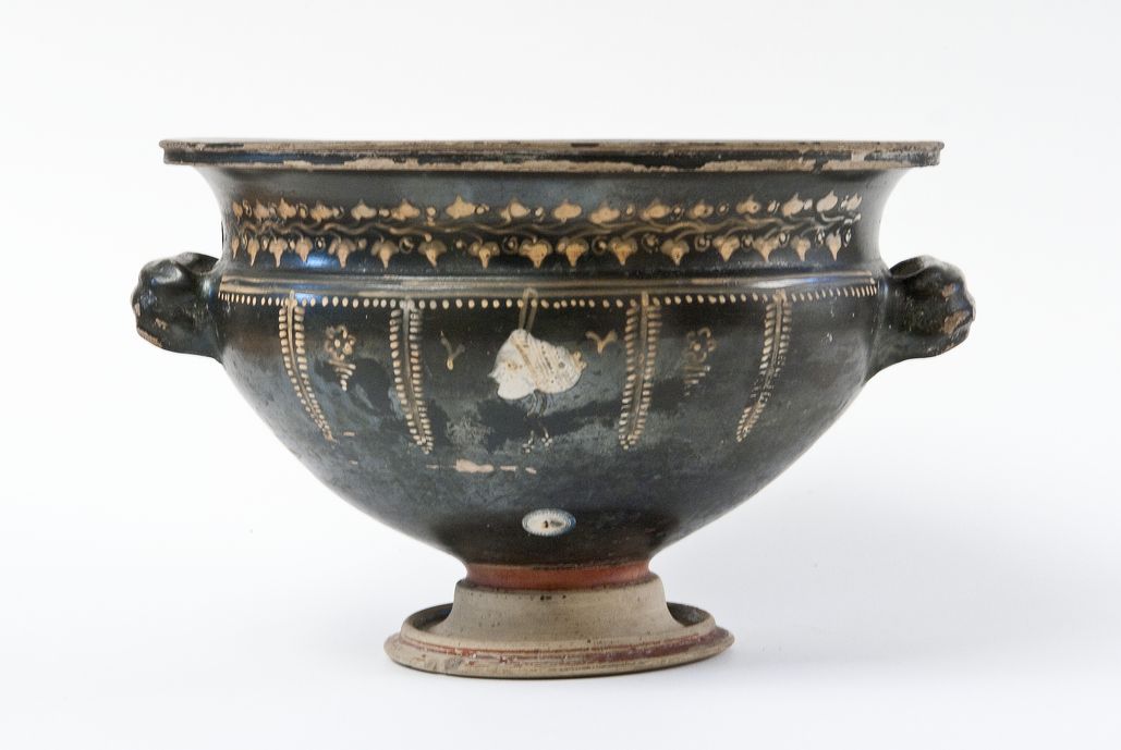 Zuppiera con maschera teatrale a vernice nera, tendente al rosso, con sovraddipinture in bianco crema e giallo oro. Orlo estroflesso modanato, ampia vasca, prese a nastro tricostolate, bassa gola di raccordo, piede campanulato. Lato A: Sotto l'orlo tralcio di edera con stelo sinuoso dipinto e girali con punti in giallo. Sul corpo coppia di linee dipinte e fila di punti, da cui pendono quattro rami secchi con foglie a trattini, che inquadrano, al centro, una maschera teatrale femminile con sakkos, dipinta in bianco con dettagli in giallo oro, di profilo verso sinistra, e tra due foglie a Y, ai lati due rosette su serie di linee digradanti. Lato B: Sotto l'orlo, ramo secco con foglie puntiformi in giallo oro.