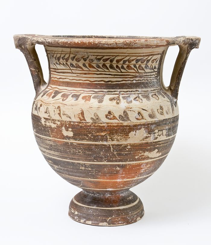 Cratere a colonnette tornito a fasce e di stile misto. Orlo a fascia e modanatura concava, nel quale confluiscono, tramite la piastra, le anse a colonnette; collo cilindrico a profilo concavo, corpo ovoidale con spalla tondeggiante, piede a echino. Decorazione a vernice monocroma rossa e brunastra su fondo naturale di argilla, con ramo d’ulivo e linee ondulate sul collo e un fregio di foglie d’edera sulla spalla, con ampie fasce parallele interamente campite a vernice rossastra sul ventre; campitura rossastra nell’orlo, nelle anse e nel piede.