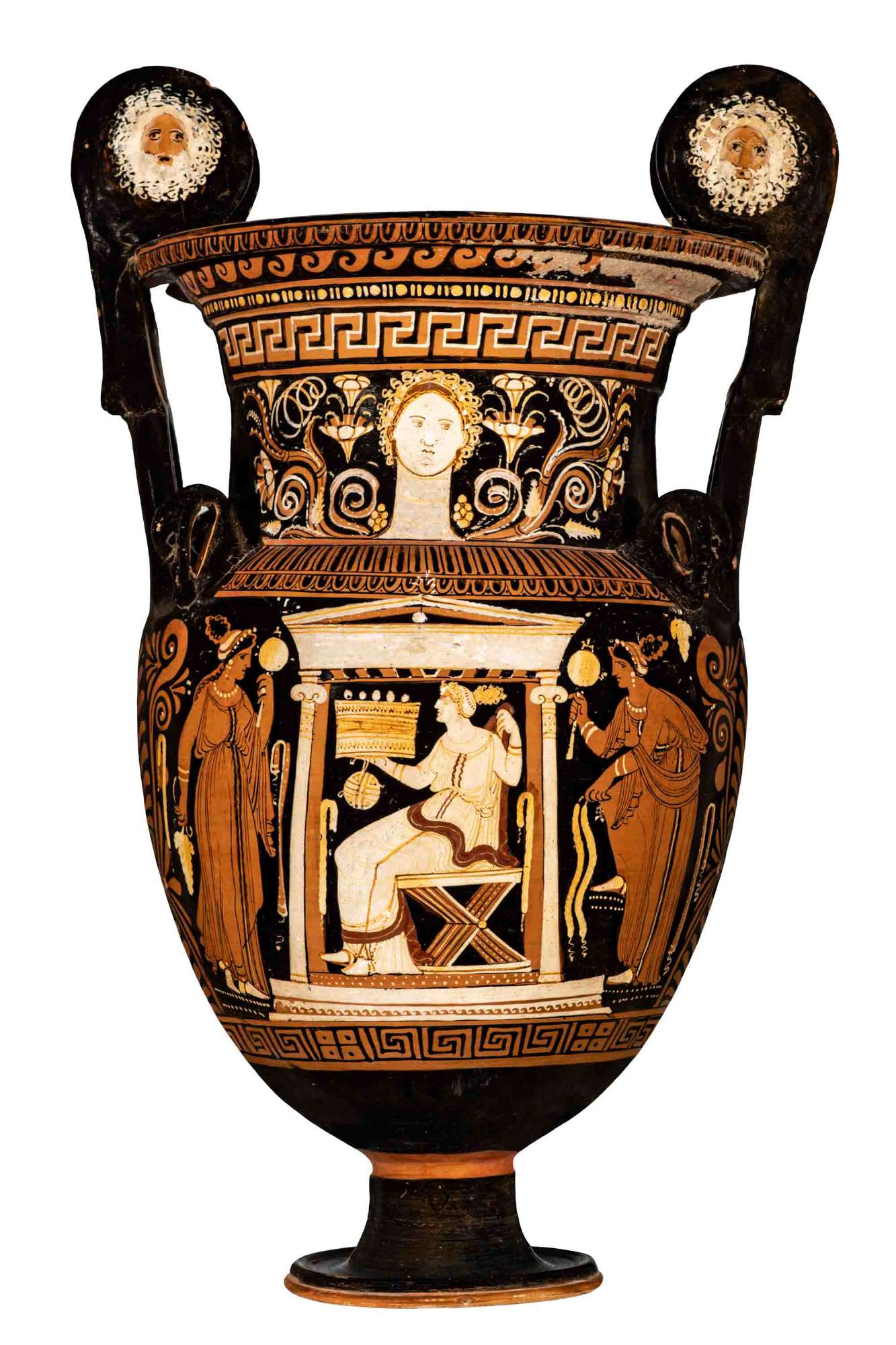 Cratere a volute con mascheroni e attacchi d'ansaa teste di cigno, a figure rosse. decorazione a fasce di meandri, ovuletti, palmette e onde marine. Lato A: offerta a defunta vestita di chitone e assisa in edicola seduta con cista e palla in una mano, ai lati due donne con uno specchio; sul collo testa femminile tra tralci e fiori. Lato B: scena di offerta alla tomba: cippo con due acroteri e bende legate intorno alla struttura; ai lati due donne offerenti uno specchio.