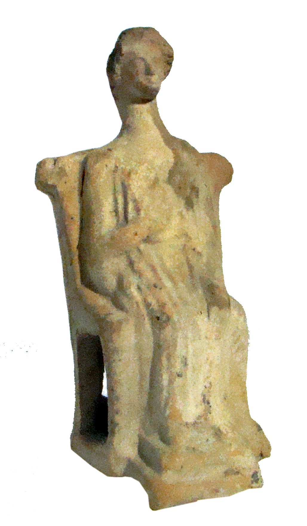 Figurina femminile in terracotta, realizzata a matrice. Cava all'interno. Largo foro rettangolare sul retro. Sul retro è visibile la cifra "630" in rosso, la cifra, sbiadita, "5111" realizzata in matita e il numero "5111", in rosso. Etichetta sul retro della base che riporta la dicitura "28 febbr. 74 Baldini GRECIA". Figura femminile assisa su trono con alto schienale. Indossa un peplo a fitte piegoline. Volto ben delineato, testa piccola su collo lungo. Non è molto visibile la capigliatura, indossa probabilmente un copricapo a cercine molto frammentario. La mano destra stringe un volatile contro il petto; la mano sinistra è appoggiata sulle ginocchia.