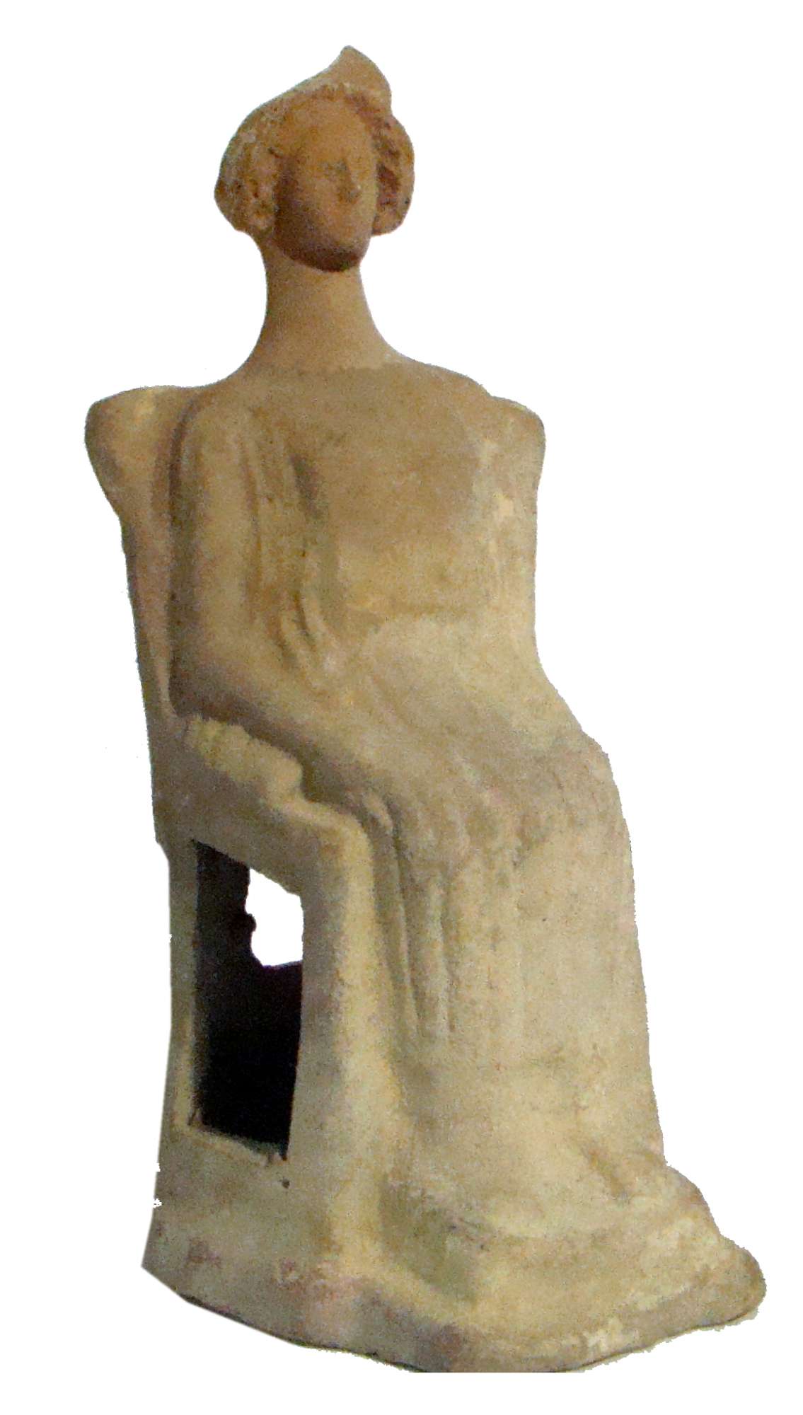 Figurina femminile in terracotta, realizzata a matrice. Cava. Cavità rettangolare sul retro. Sulla base è apposta un'etichetta con la cifra "629". Sul retro è presente un'etichetta ovale con la dicitura "28 Febbr. 74 Baldini GRECIA" apposta su precedente etichetta rettangolare. Visibile la scritta in rosso "5124=629". Retro non lavorato. Figura femminile, assisa su trono con alto schienale. Indossa un peplo. Le braccia sono sulle ginocchia e le mani stringono dei fiori. Capigliatura con scriminatura centrale e riccioli, polos.