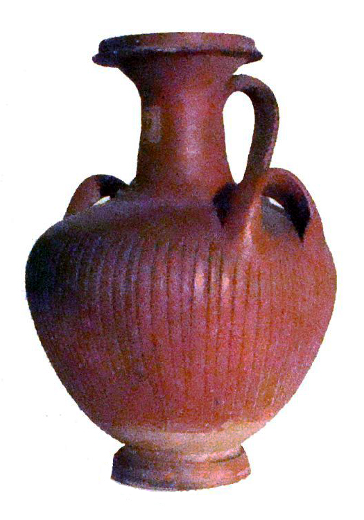 Hydria a tre anse due delle quali ad anello sul ventre e la terza verticale a orecchio sul collo. Ventre rigonfio percorso da baccellature verticali, collo lungo e stretto, labbro molto sporgente. Vernice color rosso mattone.