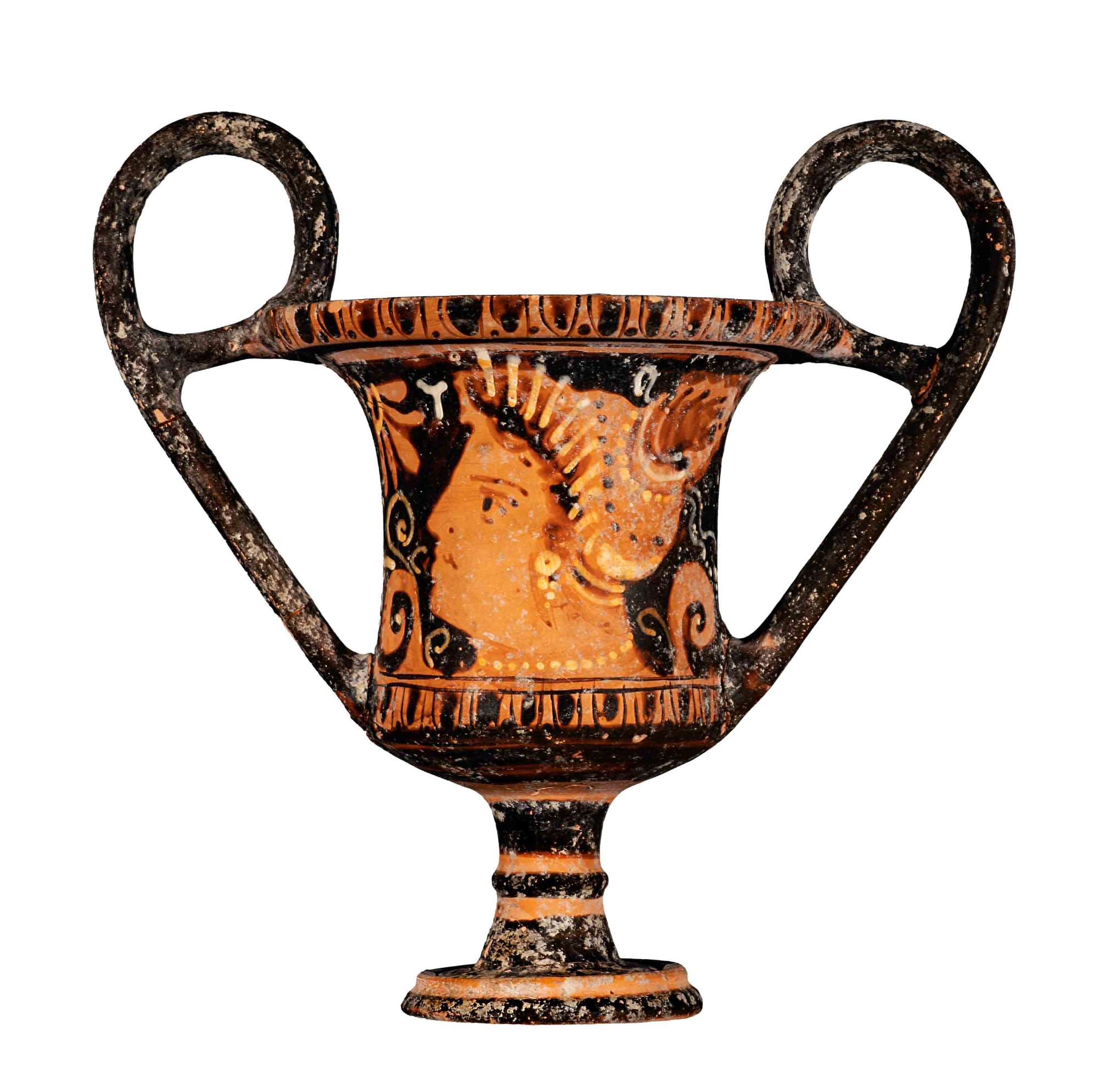 Orlo svasato con labbro estroflesso; bicchiere a profilo leggermente concavo e rastremato verso il basso; Lato A: erote con situla e cista Erote in volo di tre quarti verso sinistra; le ali, profilate in giallo e campite in bianco nella parte superiore, sono decorate inferiormente da una serie di linee diritte. Nudo, è decorato da più ornamenti sovradipinti: i capelli sono raccolti in mitra con linea centrale in giallo; stephanè a bassi raggi in bianco; orecchini, armillae ai polsi, collana ad unico filo di vaghi, cavigliera rigida e decorazioni sulle embades ai piedi, tutti in bianco e giallo sovradipinto. Nella destra regge dai manici una situla sovradipinta in bianco e giallo e decorata con linee diritte e motivo a zig zag in vernice diluita; nella s. tiene sollevata una cista con offerte e decorata con croce di Sant’Andrea con i quattro quadranti sovradipinti; subito sotto, palla a spicchi sovradipinta in bianco. Vicino alla gamba sinistra fiaccola con coronamento cruciforme in bianco sovradipinto. Sulla linea di terra a sinistra arbusto con coppie di foglie ovate a risparmio, alternate a coppie di punti in bianco sovradipinto. Sulla destra sottile colonna in bianco. Nel campo, in basso, rosetta a quattro petali profilati con bottone centrale sovradipinto. Lato B: figura femminile seduta con ventaglio e tympanon Figura femminile di tre quarti verso s. seduta su sgabello decorato in bianco e giallo sovradipinto; regge nella d. un ventaglio profilato in bianco con manico sovradipinto; nella sinistra, un tympanon con centro in giallo sovradipinto e corona di tratti e nastri in bianco; indossa un lungo chitone agganciato sulla spalla s, mentre la d. rimane del tutto scoperta; capelli raccolti in una mitra decorata con fila di punti e nastri in bianco sovradipinto. In bianco sovradipinto gli orecchini a due grani pendenti, le armillae ai polsi e la collana ad unico filo di vaghi circolari. Sulla linea di terra, a inistra., arbusto con coppie di foglie ovate a risparmio, alternate a coppie di punti in bianco sovradipinto. Sulla destra sottile colonna in bianco. Nel campo in alto a d. benda profilata con nastri pendenti alle estremità.