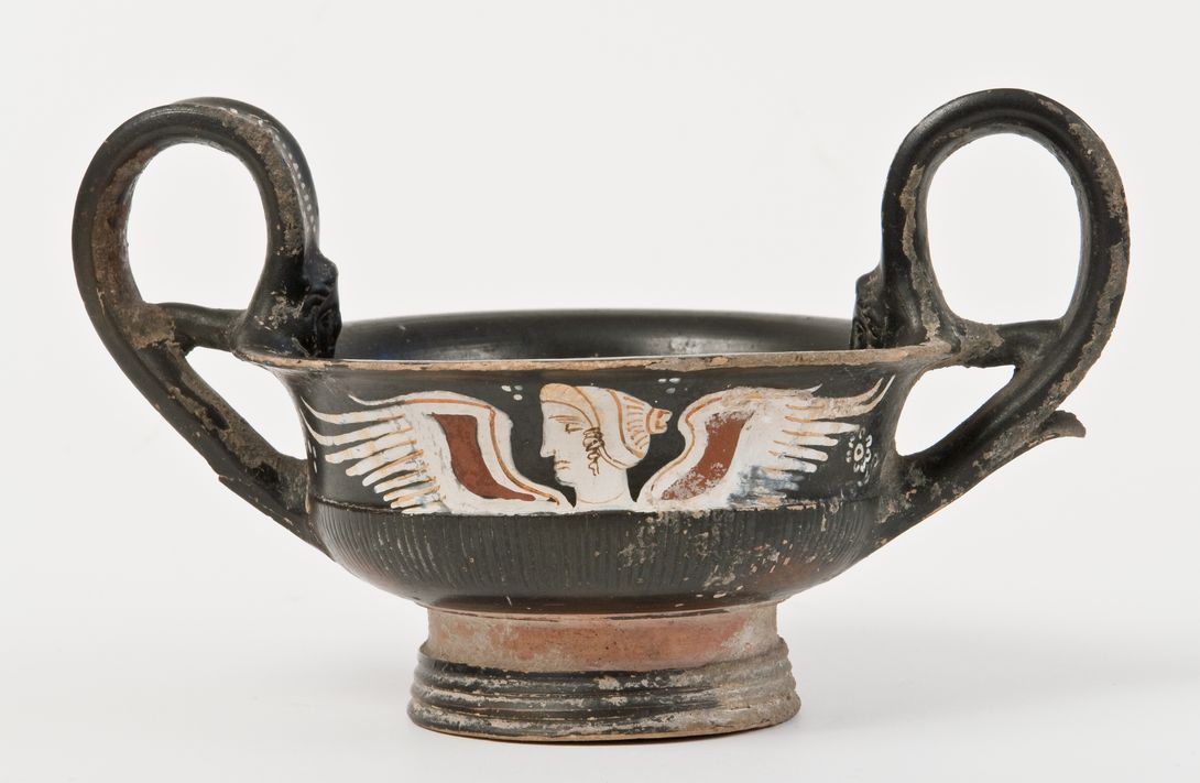 Kantharos sessile con testa femminile alata a vernice nera, tendente al rosso, con sovradipinture in bianco crema, giallo ocra e rosso amaranto ed incisioni. Orlo estroflesso, collo a profilo concavo, corpo carenato strigilato, alte anse a nastro sormontanti con linguetta esterna ripiegata verso il basso e con cordolo trasversale interno, inclinato verso l'alto, presso l'attacco delle anse all'orlo, due protomi femminili, gola di raccordo, alto piede a tromba modanato. Lato A: Sulla fascia liscia, sopra il corpo strigilato, volto femminile con sakkos, di profilo verso sinistra, tra due ali rese in bianco crema e osso amaranto con dettaglio in giallo ocra. Si tratta, presumibilmente di una Nike alata, rappresentata tra gruppi di tre punti e, da un lato una rosetta con cerchio centrale e petali a semicerchio, dall'altro un corimbo a tre punti. Interno: volto femminile con sakkos, di profilo verso sinistra, su doppia fila di punti, tra una coppia di linee concentriche dipinte in bianco e con al centro una fascia in rosso amaranto. Lato B: volto femminile con kekryphalos, di profilo verso sinistra, tra complessi di girali con fiori campanulati, gruppi di tre punti e fila di punti. Lungo le anse: rami secchi con foglie a trattini.