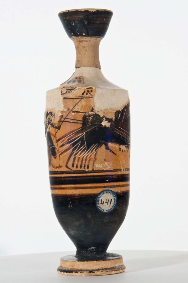 Lekythos attica a figure nere con colori aggiunti e graffito. Quadriga in corsa. L’auriga, che stringe il kentron e le redini, si sporge in avanti a spronare la quadriga; su uno dei cavalli sta un giovane fantino. L’auriga, di cui è andata perduta la testa, indossa un lungo chitone e si sporge in avanti. Con la mano destra tiene il kentron e con la sinistra le redini. Su uno dei cavalli della quadriga al galoppo, si intravede un giovane fantino. Il colore rosso è impiegato per la bardatura dei cavalli ed in alcuni punti rimangono tracce di motivi decorativi in grigio. Vengono resi ad incisione alcuni particolari della quadriga, i profili e le code dei cavalli.