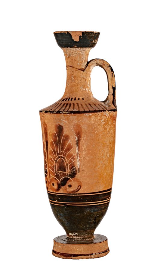 Lekytos attica a figure nere; sul ventre decorazione con tre palmette alternate a loti stilizzati su treccia; sul collo motivo a raggiera.